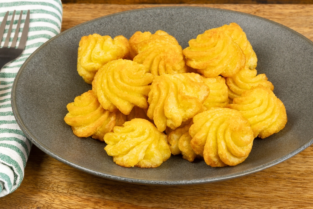 - Para preparar, use a assadeira lisa da Air Fryer Forno Mondial ou forre a furadinha com papel-manteiga, depois faça caracóis com a massa de batata deixando um pouco de espaço entre eles.