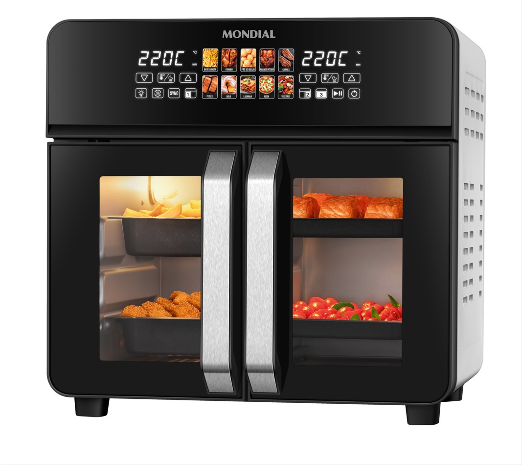 1. Organize a Air Fryer French Door Mondial com as assadeiras divididas para fazer o pão e o queijo de um lado e as carnes do outro