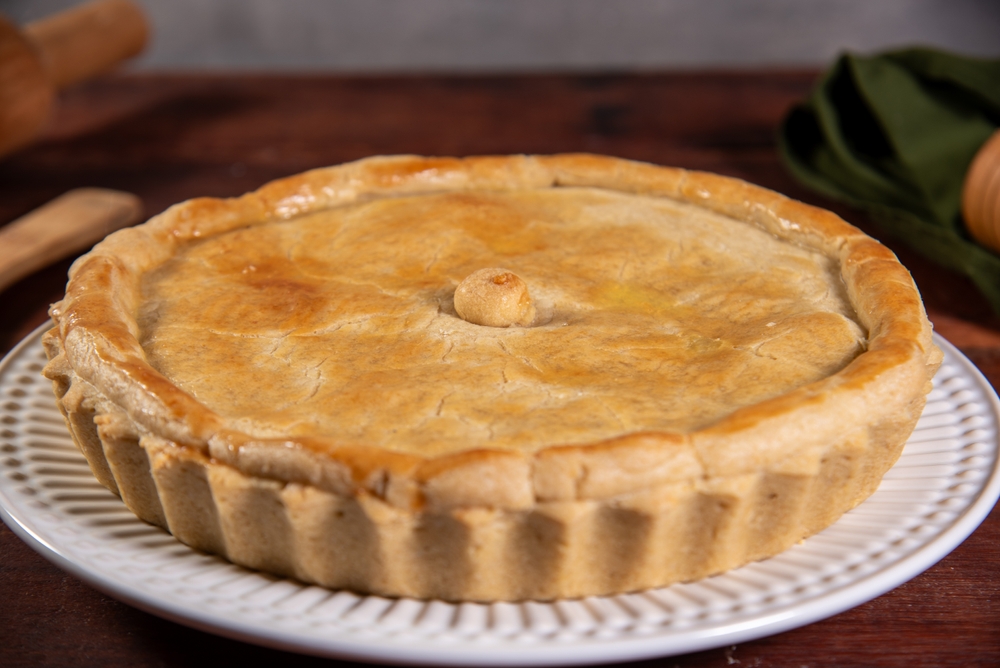 - Abra a massa entre dois plásticos com ajuda de um rolo, forre a assadeira, espalhe o recheio, abra o restante da massa, cubra e decore.