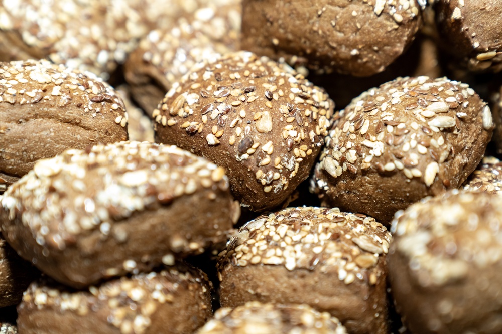 - Pincele as massas delicadamente com um pouco de água e polvilhe aveia e grãos por cima.