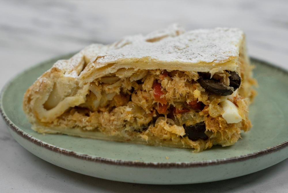 - Espalhe o recheio por cima: o atum, as azeitonas e o tomate picado.